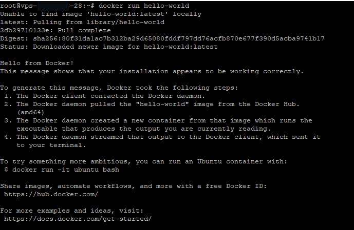 If it looks like this and it says "Active (running)" then Docker was installed completely without any problems. With a docker run hello-world you can then check whether Docker is also running correctly. The output should look like this: