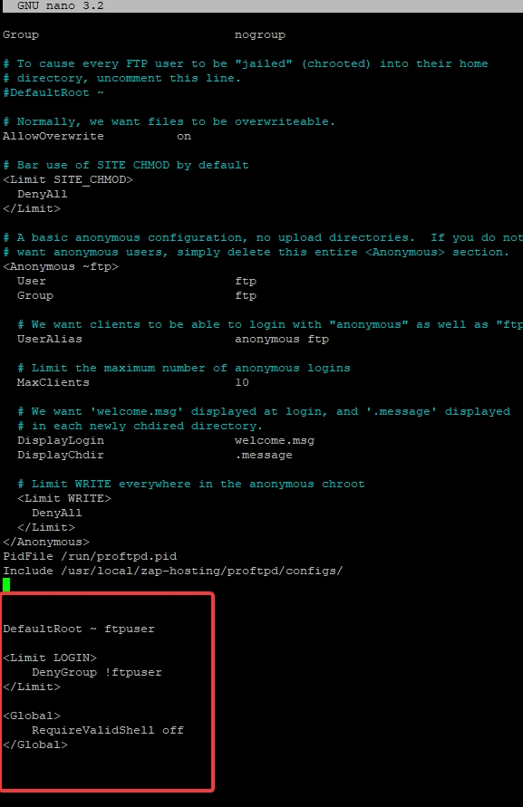 Now the FTP server must be restarted so that the changes are applied. This can be done with the following command: service proftpd restart