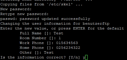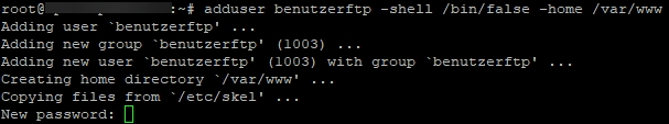Now we can add our first FTP user with the commands: adduser benutzerftp -shell /bin/false -home /var/www and then adduser benutzerftp ftpuser.