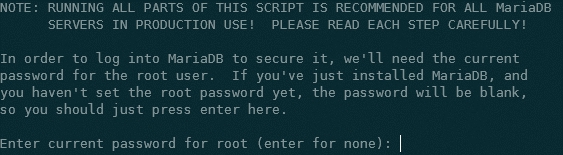 mysql_secure_installationYou will get an output as shown in the screenshot. Here you have to press Enter :