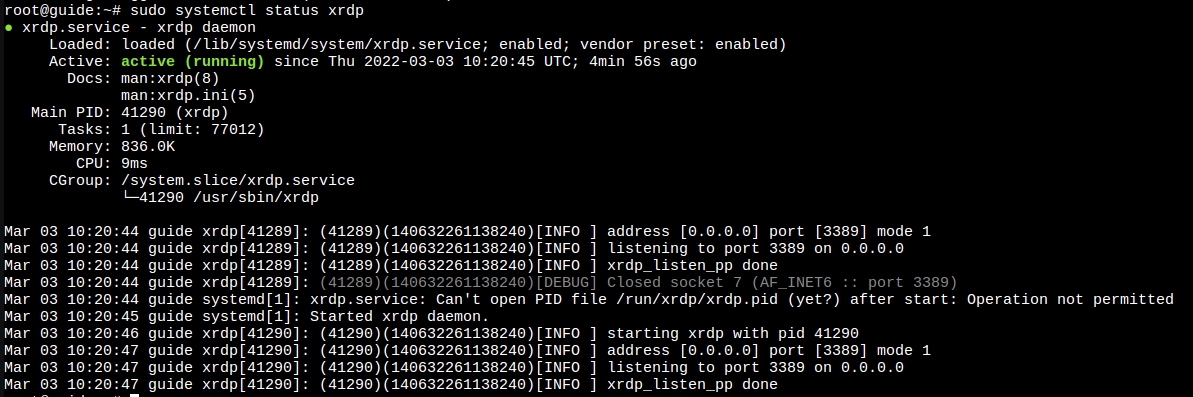 If the status is okay, a user still needs to be created. Then the xRDP service has to be restarted: