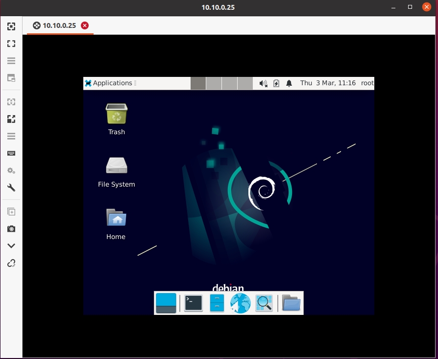 After successful login you see the desktop. With Ubuntu it looks a bit different than with Debian: