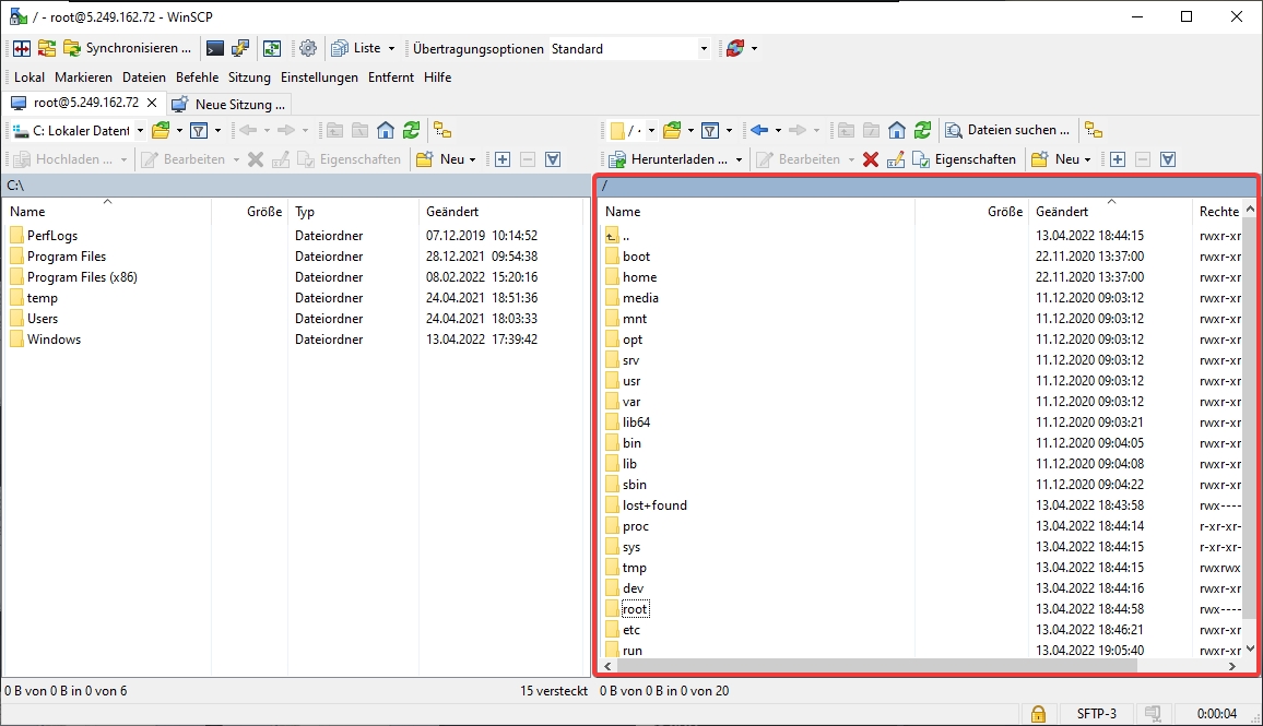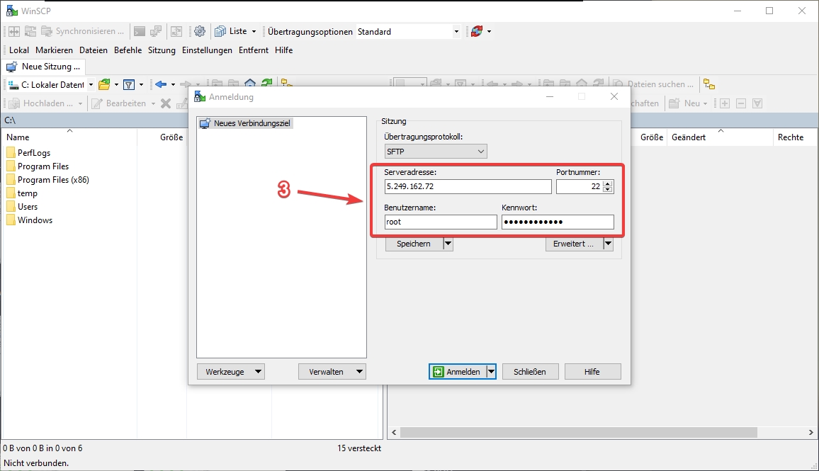 Then enter the connection data. As server address you use the IP of your server. As Ysername root and then the Password of your root user :