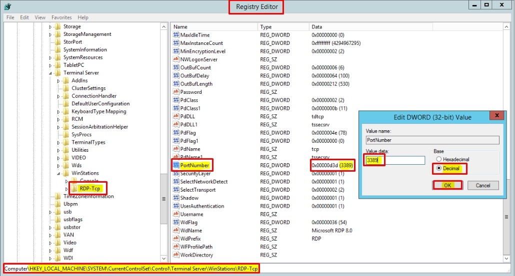 On the Edit menu, click "Decimal", edit "3389" to Your Custom Port Number, and then Click "OK" :